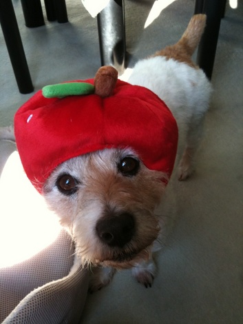 お散歩がてらに時々立ち寄るペットショップで、いろいろな変装グッズの試着が自由にできるのですが、周りにいたお客さんからも凄い似合う!!と大好評だったので、先日のセールでリンゴの変装グッズを購入♪さすがにお散歩の時は恥ずかしいからしませんが、お客様が来るときにかぶってお客様をおもてなししていま〜す☆