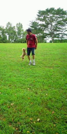 野原で元気いっぱいに「遊んで〜!」をするトイプーです〜。ジャンプした瞬間を捉えられた至高の一品だと思います〜!