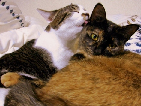 3ヶ月違いの仲良し2匹組です。 血は繋がっていませんが、お姉ちゃん(うずら)がとても面倒見がいいので、妹分(ひじき)の甘えに面倒くさそうにしながらも、よく相手してあげています。