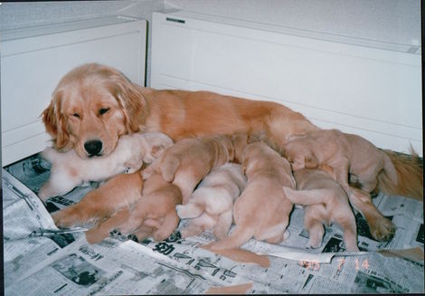 ゴールデンリトリーバーの愛犬ナナは、7匹の元気な赤ちゃんを産みました。ナナの赤ちゃんは、おっぱいの取り合いをしています。