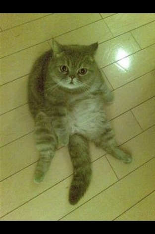 ある日家に帰った時、akiにゃんが食べ過ぎて、お腹が膨れて、動けないで、床の上に座わりながら、その可愛い目つきで見つめられたら、たまらないわ〜