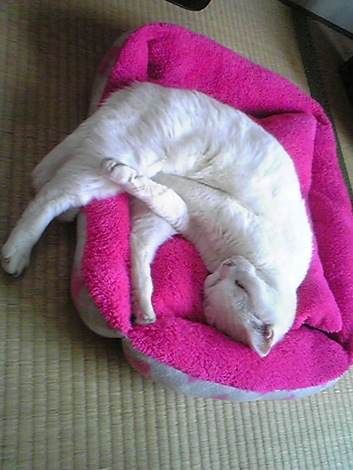 お気に入りのマイベットで寝てたら寝相が悪くなっちゃいました。 あんまり伸びてると、ベットから落っこちちゃうかも。 でもどんな夢を見ているのかな。 グーグーグー