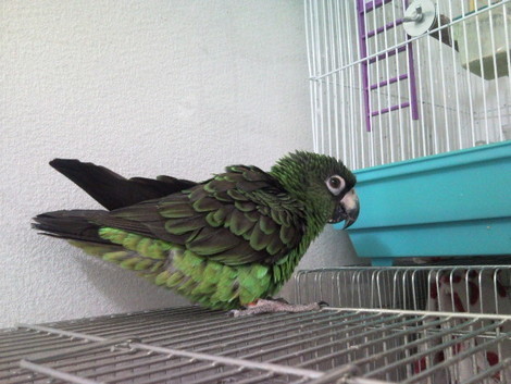 我が家のズアカハネナガインコさんです。男の子です。今からセキセイのケージにいたずらをしに行きま〜す。餌箱ひっくり返すくらいならいいけど、ケージ壊さないでね…(^_^;)