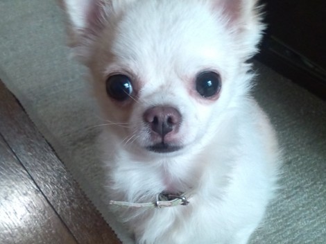 ご飯を手に持っている時に写しました。少しアップしすぎて顔がでっかいですが、目がチャームポイントでかわいいうちの子です。