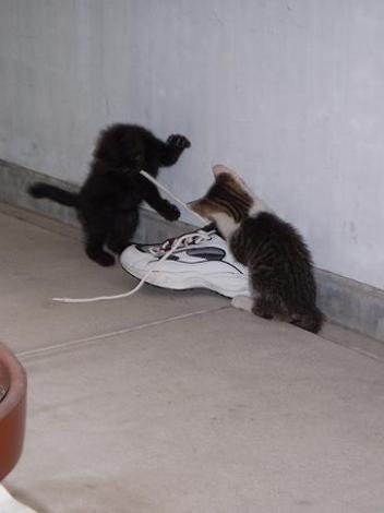 春に生まれた2匹の小さい子供たちが、おもちゃを探してベランダに出ました。自分の体と同じくらいの大きさの靴を発見してそろって靴ひもで遊んでいるかわいい一枚です。