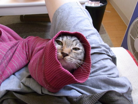 大好きなお父さんの匂いたっぷりのパーカー。潜り込んでいった先は…袖からこんにちは!今ではサイズ的に難しいショットかな…。