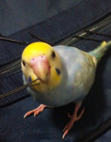 約7ヶ月の男の子の セキセイインコ、ぴこです。 カメラ目線でピンをくわえている姿です。 少し首をかしげているようにも 見えますが すごくかわいいです。 もう家のアイドルです。