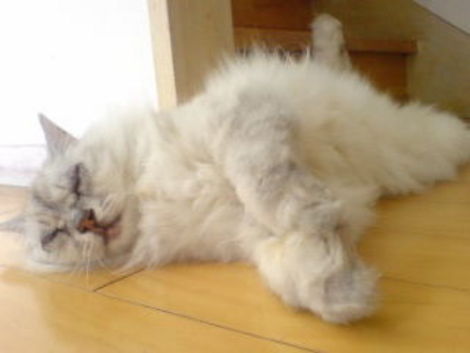 長い毛はどうやら暑いらしく、初夏から残暑の時期にかけては大抵この格好で寝ています。たまに気付かずに踏みつけてしまうのですが、本人はちょっと起きて、またぐでん……(笑)