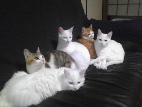 珍しく、我が家の猫が全員揃ったので撮影してみました。みんな思い思いのポーズと目線です(笑)