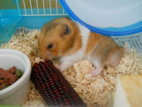 普段は木箱の中で寝ていますが、時々、狭い場所に挟まって寝ているハムさん。 この日も回し車の下に挟まっていたので、目の前にトウモロコシを置いてみました。 眠そうにしながらも、気になるみたい…。