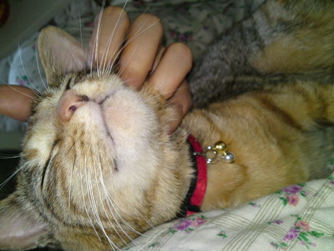 ビビリの性格なので、まだ玄関にお出迎えもしてくれないし(チラ見で覗いてるけど)、名前を呼んでも乗らない時は来ないのに、撫でてー!だけはしつこい; 撫でるとうっとりしながら、私の指を噛んだり舐めたりする女の子です。