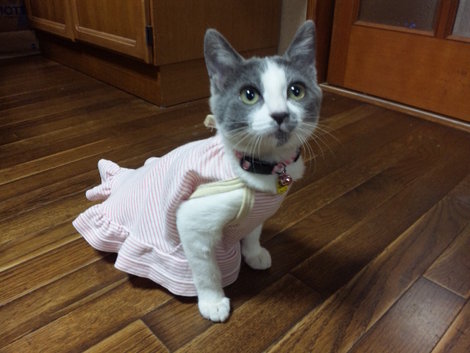 近所のワンコのおさがりのお洋服を着せてみました! ぅ〜ん?着慣れてなくて背中に違和感を感じるのか腰が抜けたように低姿勢ww やっぱりにゃんこにお洋服は不要かな!?