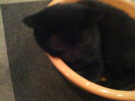 シロの相棒、エキゾチックショートヘアのこの子。もう潰れた顔がなんとも言えない、かわいすぎ。桶の中がお気に入りの場所なんだ〜。
