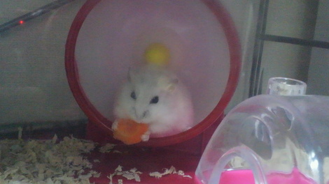 回し車で上手に食べるハムちゃん。 にんじんが大好きでおいしそうに食べる仕草に思わず写真を撮りました。見てるだけで癒されます