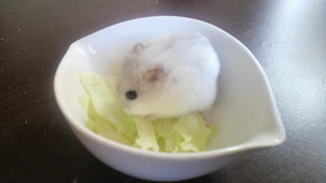 キャベツも大好きなうちのハムちゃん。1枚取って渡そうとしたところいきなりお皿の中に入って、自分の物といわんばかりにガッツいてます。幸せなんだろうなぁ