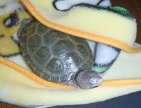 2006年に川で捕獲したときは,腹甲に穴が空いて全身カビだらけ.鼻も垂らしていました.毎日,世話をしているうちに,とても元気に.今では,専用の布団で寝ております.