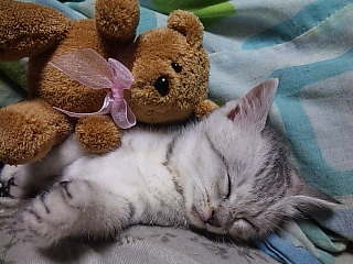 寝るまでは、かみついたり引っ張りまわしてるのに寝るときはいつも一緒。