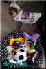 チャビーの大事なオモチャ達。この中のどれかを「投げて投げて〜!」と持ってきます! 最近の一番の起き入りは、ひっくり返すとパンダに変身するサッカーボールです。