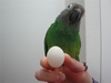 シモフリインコちゃんです。3歳(多分)にして初めて産卵。お相手はいないので無精卵です。この後、3日おきに1つづつ産み続けました。あんまり続くと栄養不足や卵詰まり等が心配なので、消灯時間を早くしたり、餌を少なめにしたりしたら、6個ほどで終わりました。