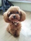 ティーカッププードルです。名前はゆんゆんです。よく可愛いって言われてます。元気満々でいつも動いてる子なので座ったまま撮れてよかったです。